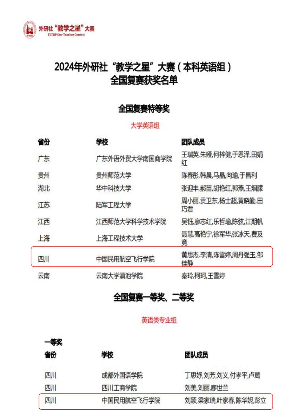 6月20日晚,2024年外研社“教学之星”大赛主题为“外语教材的有效使用:数智融合,创新育人”全国赛晋级名单及获奖名单正式公布。经全国各院校选拔推荐,组委会共收到本科英语组全国复赛参赛材料638份,其中大学英语组321份、英语类专业组168份、“理解当代中国”组149份。我校kaiyun开云官方网站的两支教师团队,大学英语组黄思杰老师、李清老师(团队成员陈雪婷、周丹强玉、邹佳静)凭借出彩的课程设计、扎实的授课功底荣获外研社“教学之星”全国复赛特等奖,顺利晋级国赛,英语类专业组刘颖老师、梁家瑞老师(团队成员叶家春、陈华妮、彭立)也获得了全国复赛一等奖的优秀成绩。