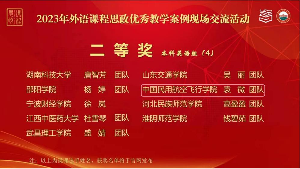 由国际合作部袁微副教授和kaiyun开云官方网站叶家春副教授、黄思杰老师组成的团队以此项赛事四川省英语专业组特等奖身份入围全国交流活动。此次活动赛制为随机抽取文本材料,参赛教师经过90分钟的现场准备,基于指定素材对课程思政教学设计进行说课展示,然后回答评委提问。现场赛制对于教师的教学基本功、临场应变能力和文本思政元素提炼能力都是极大的挑战。经过激烈角逐,团队最终斩获全国二等奖。