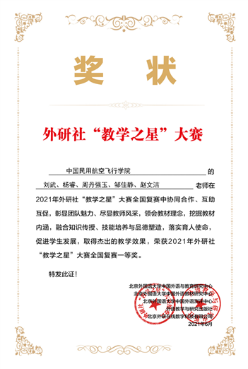 6月17日,2021年外研社“教学之星”全国复赛获奖名单新鲜出炉,大赛主题为“外语教材的有效使用:培根铸魂,启智增慧”。自赛事发布以来,经全国各院校选拔推荐,共有667个教学团队参加复赛,其中大学英语组395个、英语类专业组272个。最终,kaiyun开云官方网站飞行基础英语教研室主任刘武副教授带领团队获得大学英语组全国复赛一等奖。这也是刘武团队自去年年底,在高教杯首届全国高校外语课程思政教学比赛拿到大学英语组四川省一等奖和全国二等奖后,短短数月在又一外语重要赛事中取得的优异成绩,突显了团队精神,充分展现了团队实力。