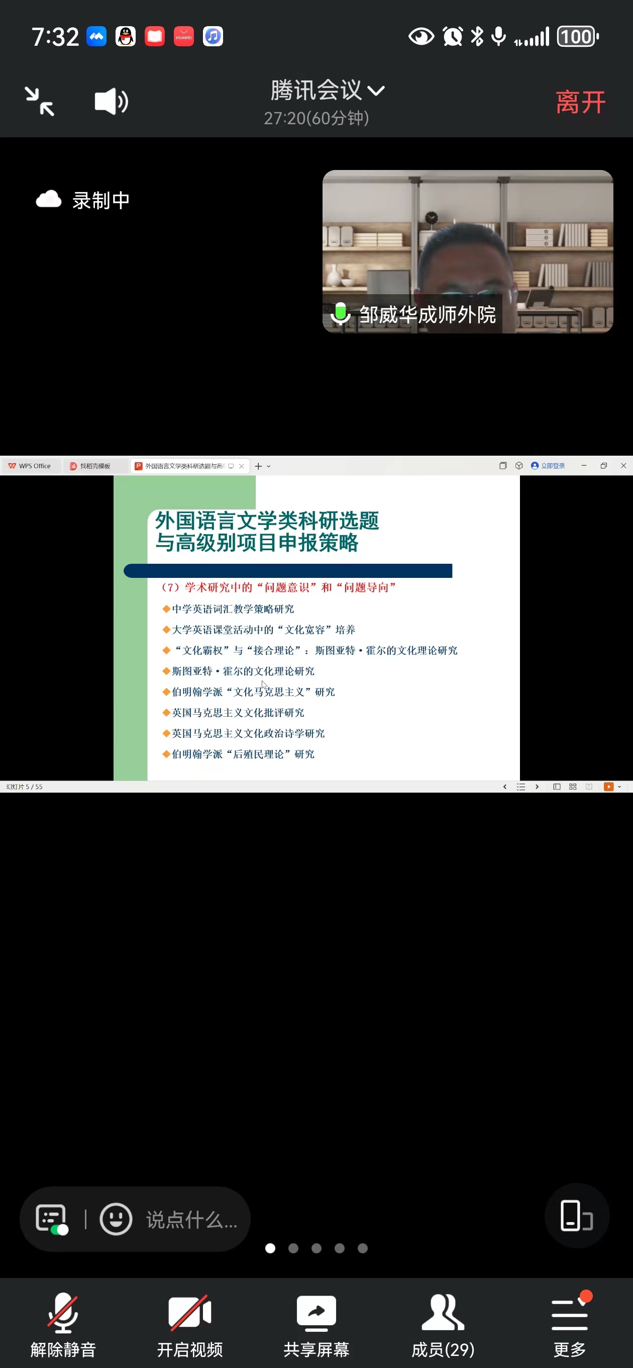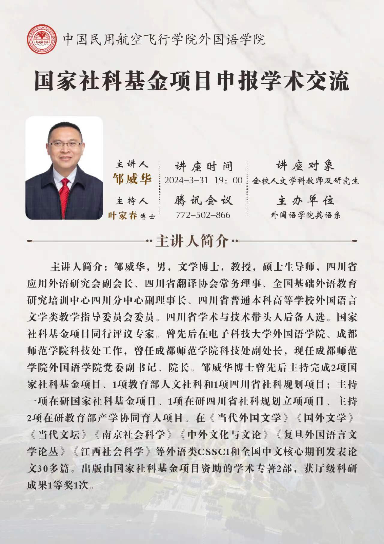 2024年3月31日晚上7点,kaiyun开云官方网站全院老师和研究生一起相聚云端,参加英语系主办的关于国家社科基金项目申报的学术交流活动。本次交流特别邀请成都师范学院kaiyun开云官方网站院长邹威华教授分享他的申报及评审经验。讲座由英语系叶家春博士主持,kaiyun开云官方网站院长肖凌教授及kaiyun开云官方网站师生参加了此次讲座。