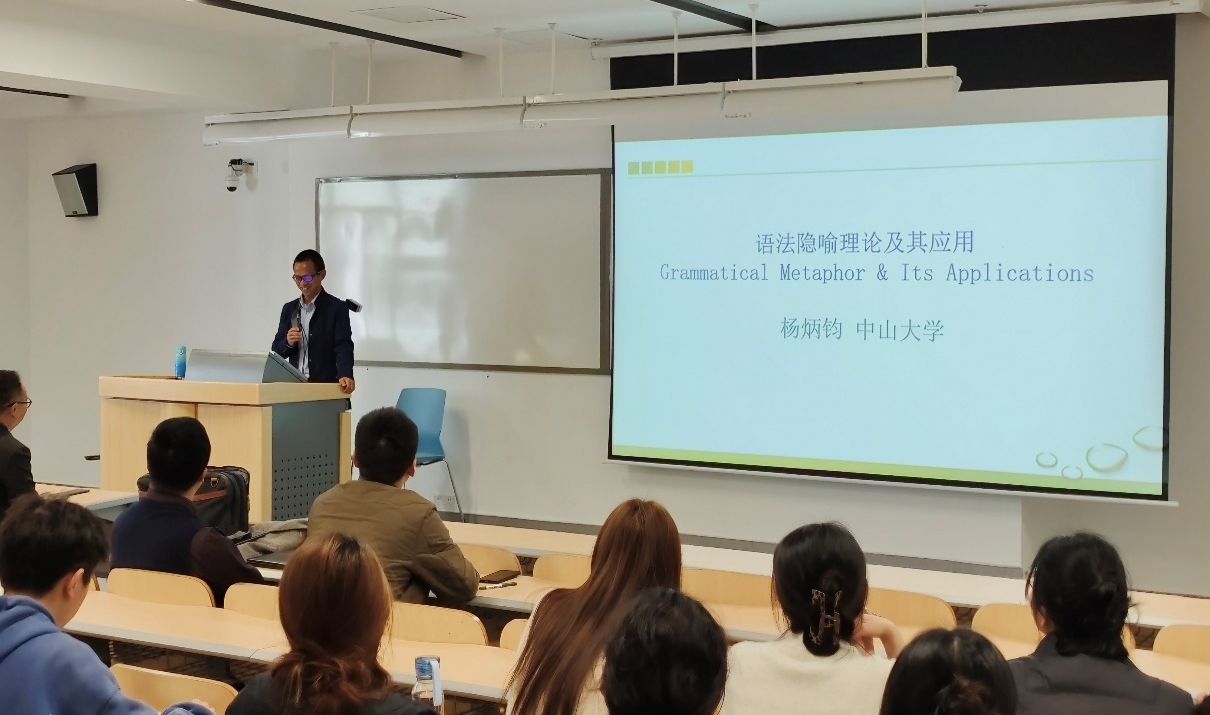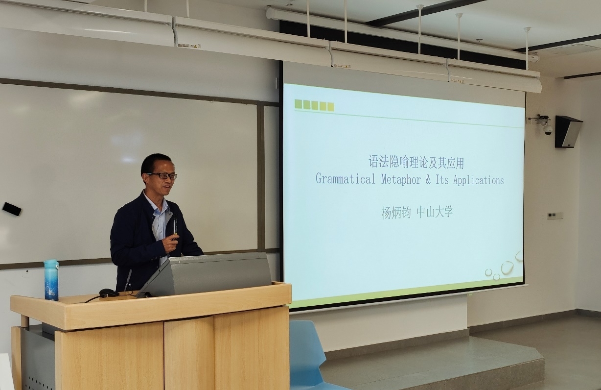 3月24日下午,kaiyun开云官方网站特邀中山大学博士生导师、中国英汉语比较研究会英汉语篇分析专业委员会会长杨炳钧教授,为师生带来“语法隐喻理论及其应用”专题讲座。讲座由学校教师发展与评估中心副主任黄大勇主持,kaiyun开云官方网站院长郑丽致辞,吸引了众多师生参与,现场氛围热烈。