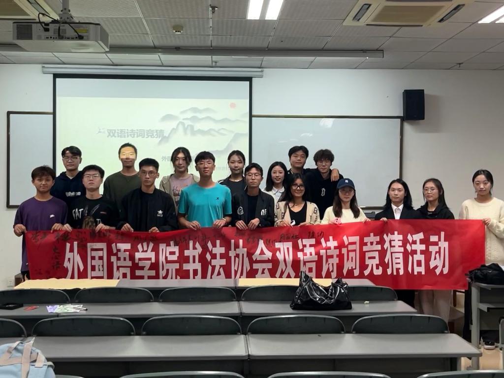 流光容易把人抛,静了夏蝉,落了秋叶。转眼间,秋风送爽,硕果累累。在这个季节里,一切都是浪漫的,一切都赋予了诗意。同学们既可以入堂即静,入座即学,在知识的海洋里畅游;也可以在操场上挥洒汗水,听歌漫步,更可以来一场紧张刺激的双语诗词竞猜比赛。 11月5日,为提升学生外语能力,弘扬中国传统诗词文化,营造浓厚的外院人文氛围,由kaiyun开云官方网站团委主办、学院书法小组承办的“双语诗词竞猜活动”在5教412教室成功举办。