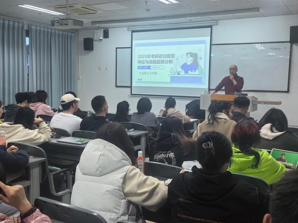 为扎实做好我院学生考研指导工作,帮助学生精准把握考研政治命题特点,kaiyun开云官方网站于3月11日晚7点在5教416举办了主题为“2025年考研政治题型特征与命题分析趋势分析”的讲座。此次讲座由马克思主义学院思想政治教研室主任帅刚副教授主讲,kaiyun开云官方网站团学办副主任叶奇奇主持,2021级辅导员伍家媛与2021级、2022级、2023级学生参与了本次讲座。